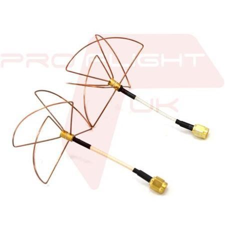 Circular polarized antennas, also known as "clover leaf/skew planar antennas", are a great way to increase the performance of your FPV system. The circular polarization helps to reject "multipath interference", a problem that plagues standard dipole stock antennas. Proven to increase range, video clarity and object penetration, circular polarized antennas have become the standard after-market 'essential' upgrade for modern FPV systems. This is a matched 3 leaf Tx to 4 leaf RX set with short cable length for a clean, direct installation with SMA connectors.